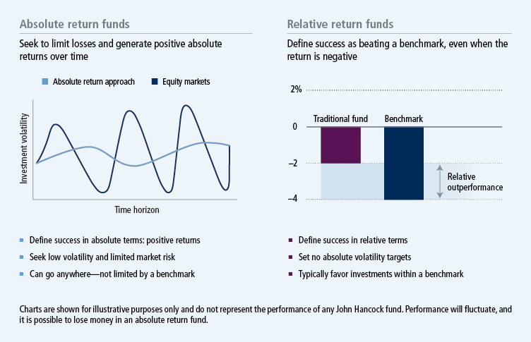 Absolute return investing is often contrasted with relative return investing. Relative return investing seeks to outperform a benchmark, such as the S&P 500 Index. Absolute return investing, on the other hand, seeks to generate positive returns in all market environments.