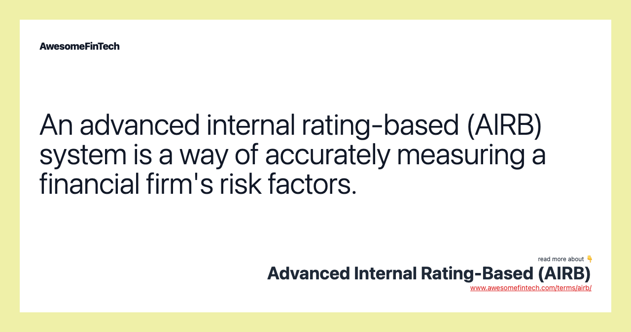 Advanced Internal Rating-Based (AIRB) is a financial risk assessment tool used by banks and other financial institutions to measure the creditworthiness of potential borrowers. It uses a combination of internal and external data to generate a score that assesses the likelihood that a borrower will default on a loan. Banks use this score to determine how much to lend and at what interest rate to charge on a loan. AIRB also helps banks understand the risks they face and set appropriate lending levels. It is important for financial institutions to use AIRB when evaluating borrowers in order to protect their investments and minimize their losses. AIRB can also be used to improve the overall efficiency of the lending process and help banks make informed decisions about who to lend to.